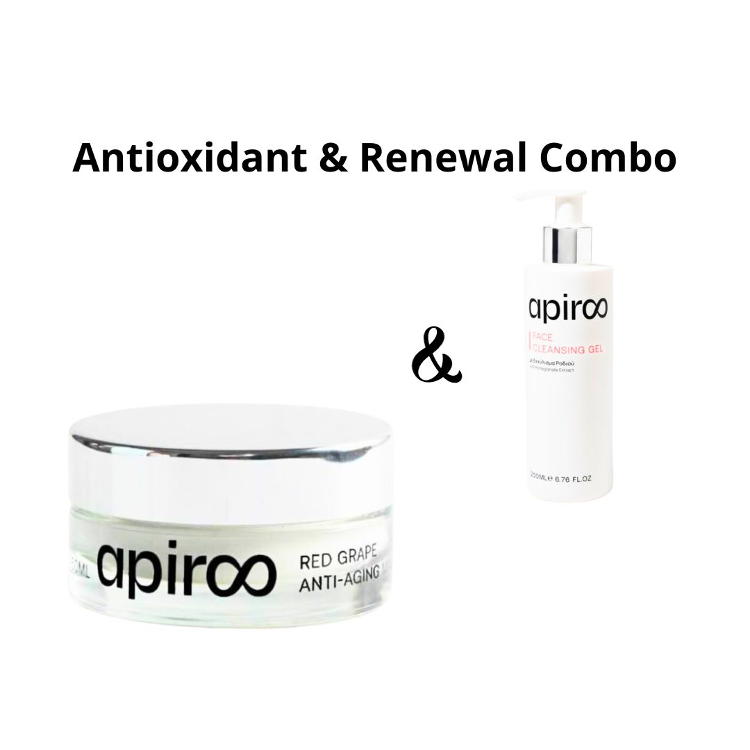 Το Antioxidant & Renewal Combo συνδυάζει το Καθαριστικό Προσώπου με Ρόδι και τη Μάσκα Αντιγήρανσης με Κόκκινο Σταφύλι για ολοκληρωμένη περιποίηση σε δύο βήματα.